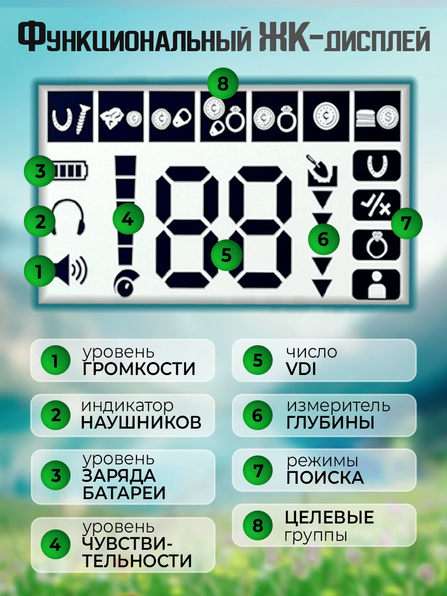 На корпусе — монохромный ЖК‑дисплей: он чётко показывает информацию об обнаруженных объектах и текущих настройках. Всё под контролем, всё на виду.