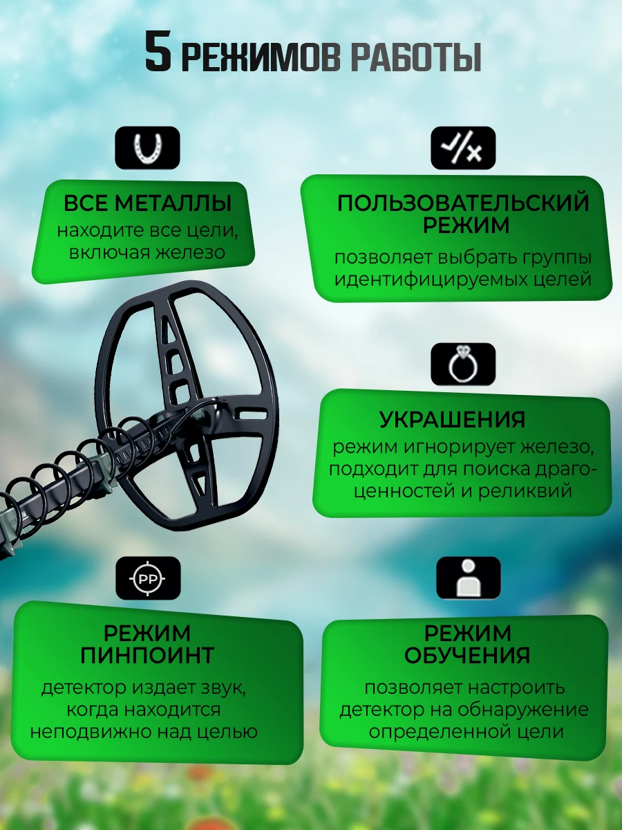 GoldFind‑55 Pro предлагает 4 режима поиска — выберите подходящий под вашу миссию: