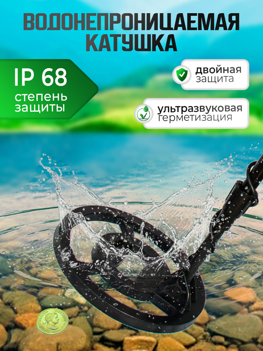 Большая катушка диаметром 9 дюймов (≈ 22.9 см) даёт увеличенный радиус обнаружения. Благодаря ей металлоискатель находит: