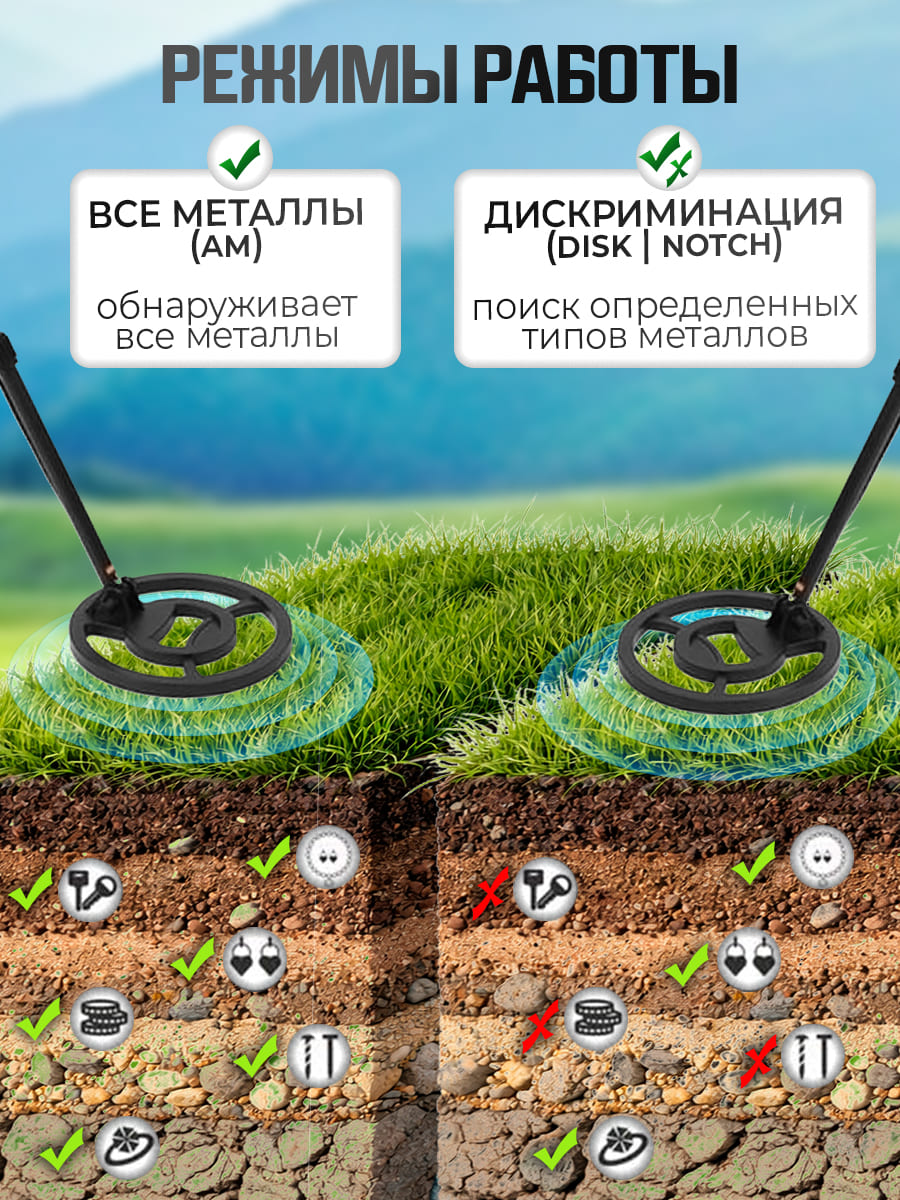 ЖК‑экран, несколько режимов поиска и дискриминация делают процесс интереснее и продуктивнее. Аудиосигнал с разными тональностями помогает быстрее научиться различать типы металлов на слух — это как новый навык, который развивается с каждой находкой.