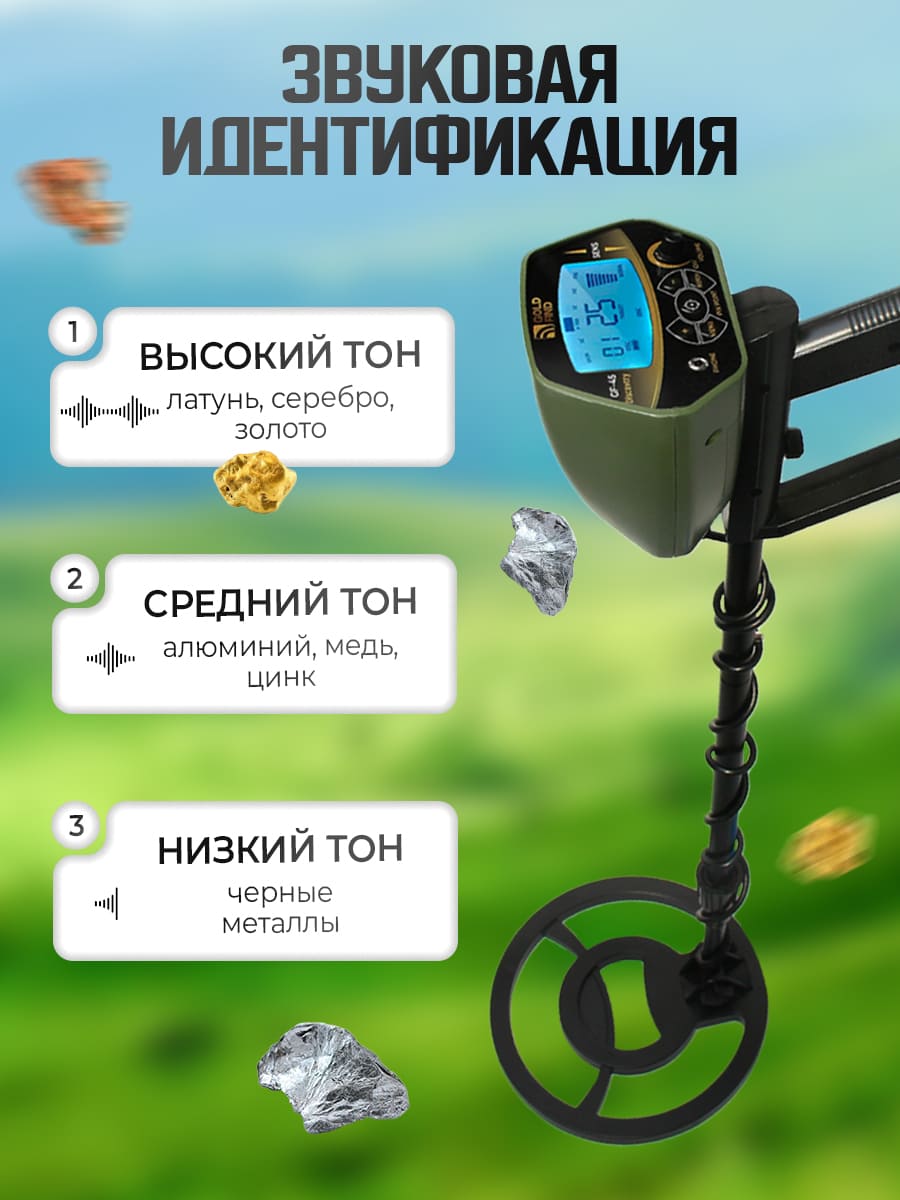 аудиосигнал с разной тональностью для разных типов металлов помогает «слышать» находку ещё до того, как вы её увидите. Например, медь звучит иначе, чем железо, — со временем вы научитесь различать эти звуки.